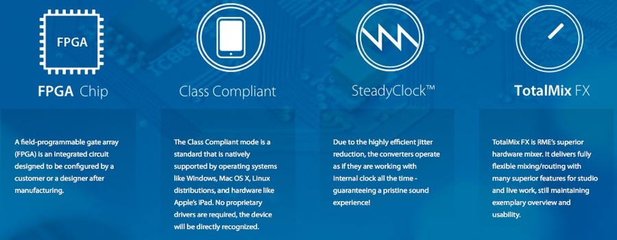 As latências são incríveis e negligíveis mesmo a 96Khz não será difícil trabalhar com buffer de 64 ou mesmo 128ms com um peso mínimo para o computador, graças á tecnologia RME e seus FPGS (DSP), tudo isto com um utilização extensa com por exemplo todas as entradas e saídas a funcionar (incluído ADAT) e com EQ.s, Dinâmicos e Echo, Reverb por intermédio do software de gestão e mistura TotalMix.