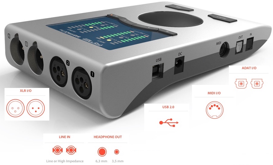 Para completar temos tambem uma entrada e uma saída ADAT e duas entradas MONO (ou com 1 estéreo) em Jack para linha ou até Hi-Z (para guitarras) com protecção de sobrecarga.